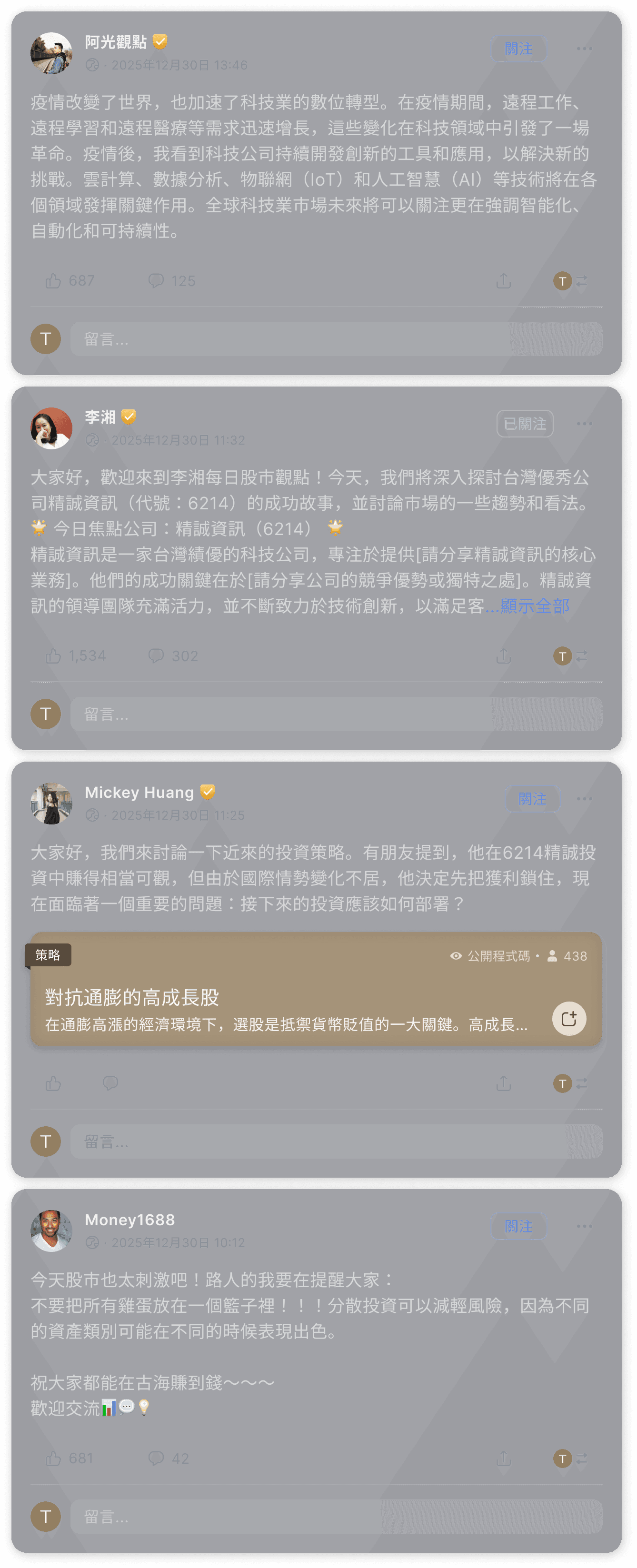我們建構了一個能深度交流的空間,讓用戶在分享觀點與投資策略的同時,能直接分享指標、策略、選股及報價等量化腳本,打破了傳統社群僅限於文字和圖片交流的框架,大幅提升了從社群交流到實際操作的互動價值。
